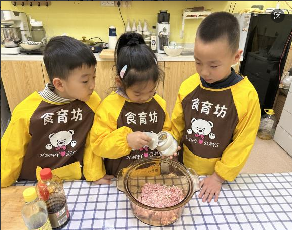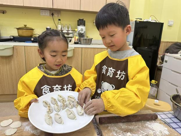 在食育坊里,孩子們穿上小圍裙,變身小小廚師。在老師手把手的指導(dǎo)下小心翼翼地剁著餃子餡,案板上的“噠噠”聲此起彼伏。和面時,孩子們伸手揉、捏、壓,感受著面粉從松散到成團的變化,臉上沾了面粉也笑得特別開心。