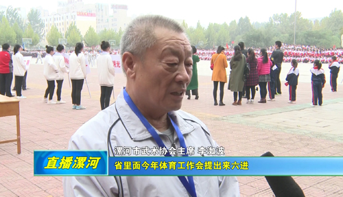漯河市武術(shù)協(xié)會主席李洳波:國家對武術(shù)、包括體育這方面都非常重視,省里面今年提出來六進,武術(shù)進校園放的比較靠前,所以咱漯河既然是國家級非物質(zhì)文化遺產(chǎn)項,所以說武術(shù)進校園是咱必須要做到的一個,因為它不但要培養(yǎng)下一代,而且要把漯河的延續(xù)了幾百年的武術(shù)文化,咱要給它發(fā)揚光大。