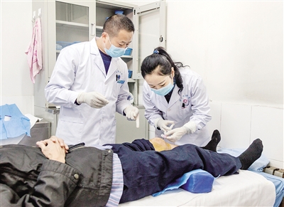 1月8日上午,在市中醫(yī)院針灸推拿科的一間病房里,多位醫(yī)務(wù)人員忙碌而認(rèn)真地扎針、拔罐、推拿、電療、牽引……