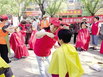 5月13日上午8點半,在市區(qū)煙廠花園廣場,閆海燕半蹲著身體,拱著腰,一手拿著剪刀,一手拿著梳子,認真地為一位老人理發(fā)。“我以前在家經(jīng)常幫奶奶剪頭發(fā),現(xiàn)在經(jīng)過一年多的鍛煉,手藝更加嫻熟了。”閆海燕笑著說。