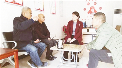 在新風胡同社情速遞服務站,社區(qū)工作人員(右一、右二)正在和居民聊天。