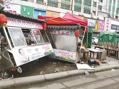 記者在現(xiàn)場(chǎng)看到,常女士家和相鄰的孟女士家的餐車(chē)被撞得歪在了一起,鍋碗瓢盆散落一地。現(xiàn)場(chǎng)并沒(méi)有看到肇事車(chē)輛。