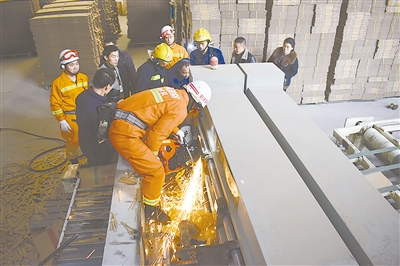 怎么辦?救援人員分為兩組,一組對機(jī)器進(jìn)行拆卸,一組利用撬杠等工具撬動鋼卷軸。最終,被困女工被成功救出。