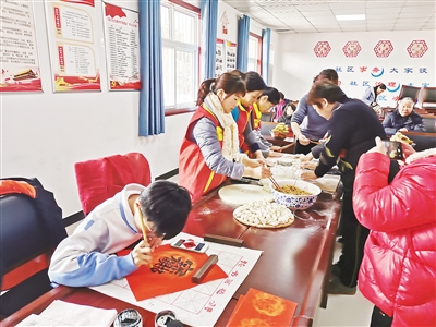 活動開始前,社區(qū)共建單位漯河市實(shí)驗(yàn)中學(xué)的老師和學(xué)生們進(jìn)行了寫春聯(lián)、送春聯(lián)活動,社區(qū)志愿者則在一旁包餃子。