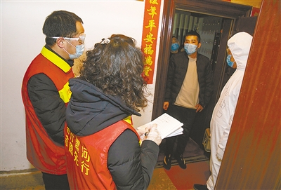 郾城區(qū)沙北街道泰山社區(qū)有物業(yè)管理健全的小區(qū),也有開放式小區(qū),還有20多個家屬院,常住人口近萬人。從大年三十開始,泰山社區(qū)18名工作人員一直堅守在防控一線,用實際行動守護(hù)社區(qū)居民安全。圖為社居委工作人員登門為居家隔離者進(jìn)行身體檢測。記者 楊 光 攝