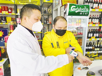 王黎明所在的社區(qū)有5平方公里,居民將近1萬(wàn)人,最近復(fù)工復(fù)業(yè)的店鋪有百十家, 他每天都要把這些店鋪?zhàn)邆€(gè)遍,就像醫(yī)院里的醫(yī)生“查房”一樣,給店鋪的員工測(cè)量體溫,了解他們的身體健康狀況,然后做好登記。同時(shí),他還要指導(dǎo)店鋪開展好環(huán)境消毒,給員工們講解防疫知識(shí)以及如何正確佩戴口罩。