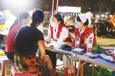 6月13日晚,漯河柳江醫(yī)院組織十多名醫(yī)護(hù)人員走進(jìn)市體育場夜間廣場消費(fèi)點(diǎn)開展義診活動。