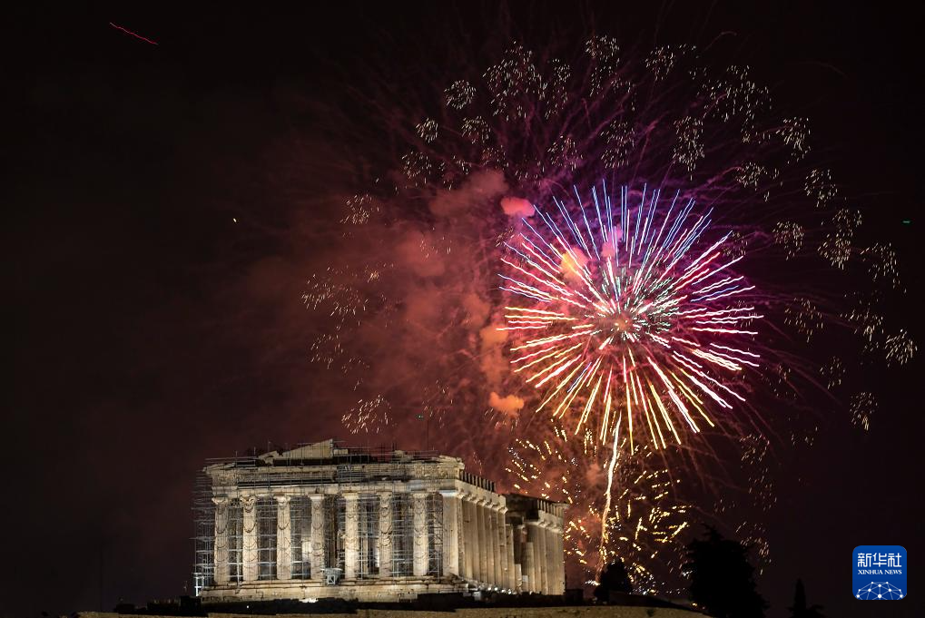 2024年1月1日凌晨,在希臘雅典舉行的迎接新年慶祝活動中,焰火照亮雅典衛(wèi)城。