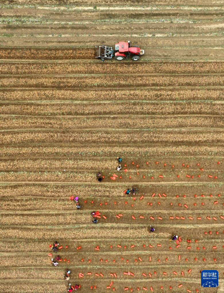 10月30日,在河南省沁陽市王曲鄉(xiāng)東王曲村一家庭農(nóng)場(chǎng),農(nóng)民在田間收獲紅薯(無人機(jī)照片)。