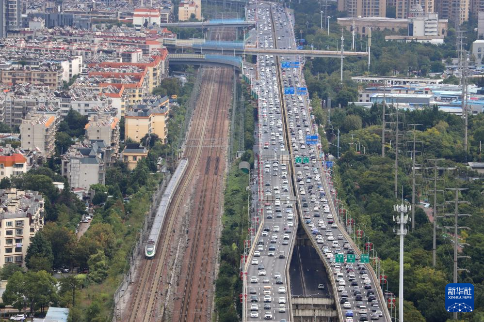 10月8日,動車組列車穿行于昆明城區(qū)。